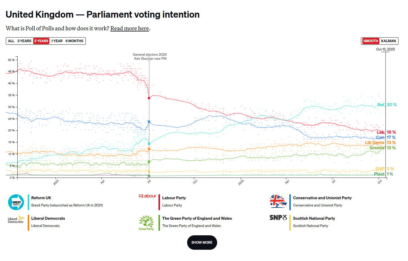 If I was betting on the market, I would agree that at this current point in time the probability is lower than 20%. Reform is essentially a protest vote & since Starmer is currently unpopular they’re picking up opinion points. The most likely outcome is by the next election the main parties return to their places and reform drops back down, but reform will have a few years to try to come up with a way to turn those people into real voters, and it’s possible they could do it.