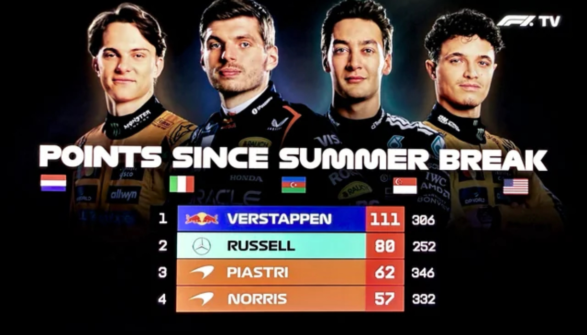 @AlexanderTheGreater Yes, but 40 points are still a lot to recover. I get that Verstappen chances are increasing, but being 41% vs Piastri 32% is nonsense. Right now Oscar is still 1st with a discrete advantage. If he suddenly starts delivering good results again the championship will be locked