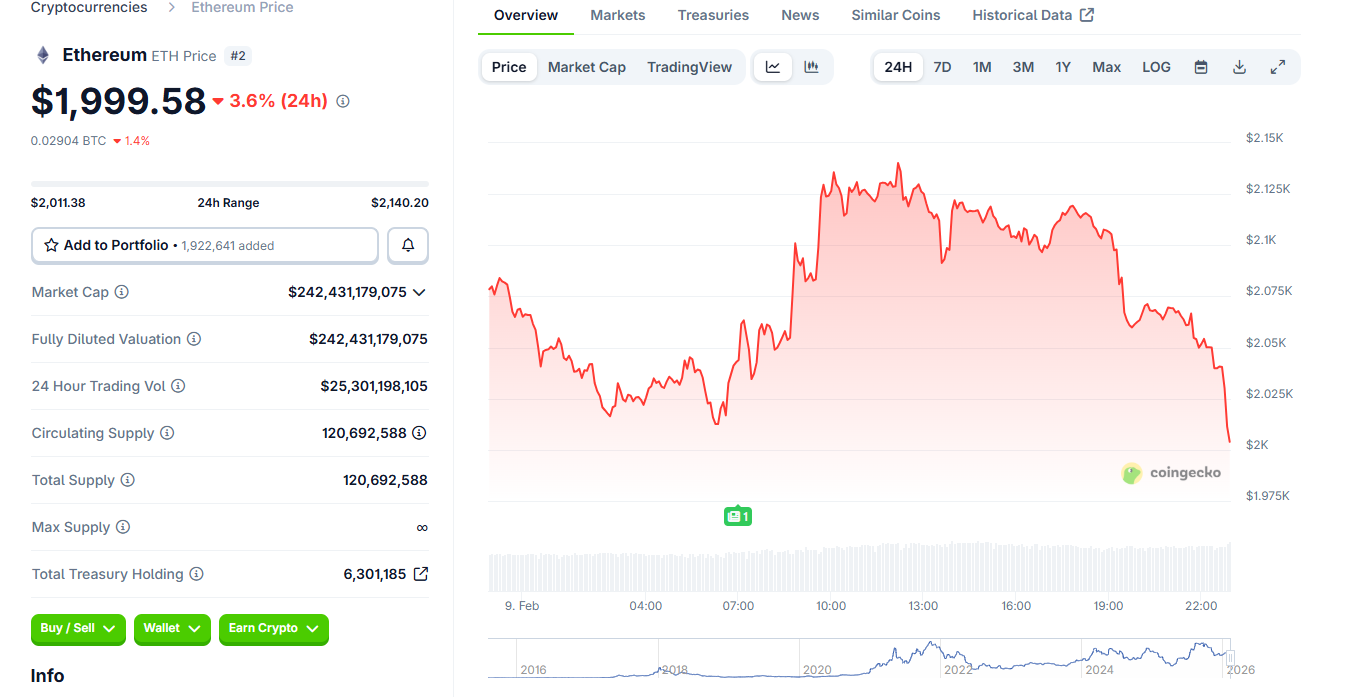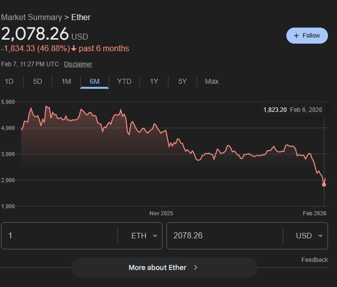 Ethereum hit an all-time high of $4,954 per token six months ago, but has experienced a sharp decline in early 2026. As of February 6, 2026, Ethereum successfully reclaimed the $2,000 mark after a week of intense selling pressure that saw ETH plunge to lows not seen since May 2025. The price of Ethereum is $2,087.91 as of Feb 7, 2026, placing it just above the $2,000 threshold. Prices are falling due to a mix of crypto market meltdown, broader tech and AI stock weakness, forced ETH liquidations, and deteriorating investor sentiment.