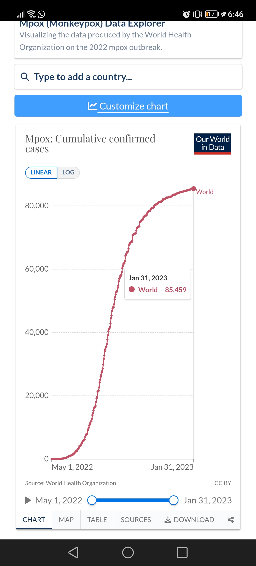This question resolves to YES if there are >=85,500 confirmed cases of monkeypox worldwide by year-end, using the cumulative confirmed cases of Jan 31st 2023, from Our World in Data: