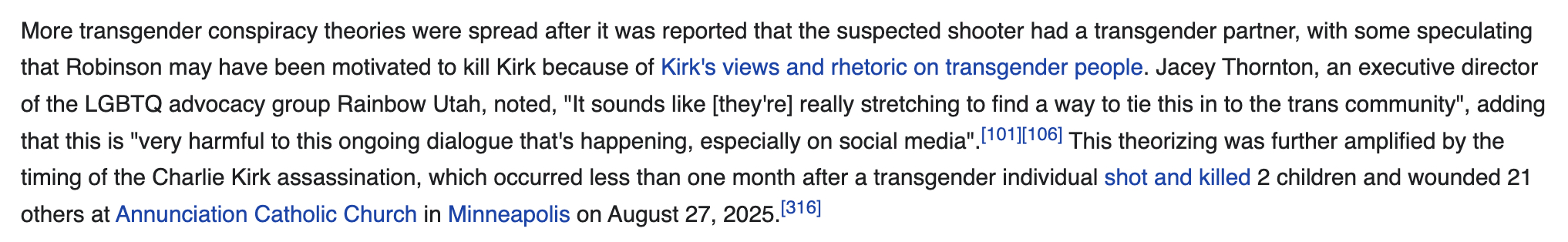 I'm deeply distrustful of any residual "he must have been a groyper" narratives. Despite the fact that my priors were pointing me towards groyper, it REALLY doesn't feel like this is the case; everyone still saying he was sounds like they're putting out a mix of cope, conspiratorial thinking, or just misinformation. I'm willing to believe it if there was the evidence for it, but I haven't seen it and I'm going to need so much more than what we've got. I have doubts that'll happen.