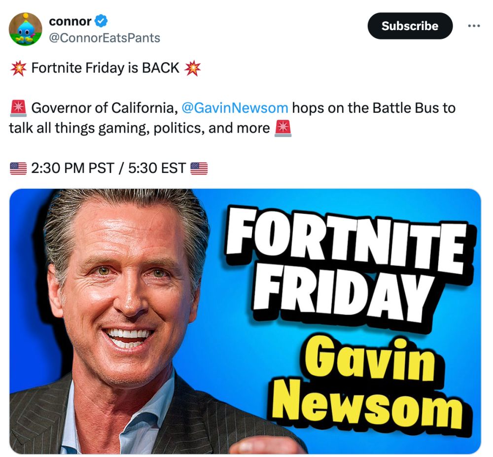 What will happen during ConnorEatsPants' Fortnite Friday with Gavin Newsom? [ADD ANSWERS]