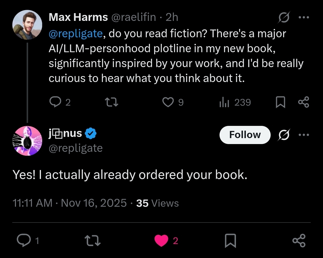 Each submarket resolves YES if that person either gives the book a positive review on some website, such as Amazon, or if they signal-boost the book in a way that's obviously meant to get people to read it (talking about the book in a negative way won't count; neutrally mentioning it on ๐ or Substack will). If someone gives a negative review or simply doesn't mention Red Heart publicly by the end of the year, they will resolve NO. If a review or mention is ambiguous, I will ask Claude 4.5 Sonnet to categorize it.