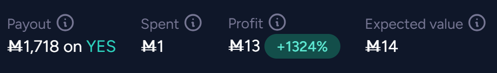 @TheAllMemeingEye These are the funnest bets though. ONE THOUSAND THREE HUNDRED PERCENT PROFIT!? THINK OF ALL ADDITIONAL ONE POINT PREDICTIONS I CAN MAKE!