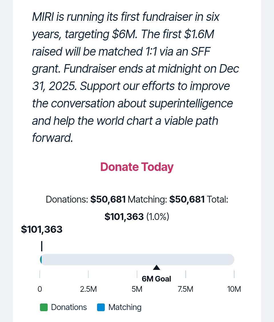 Will MIRI receive more than 1 billion USD in funding in a single year before 2030?