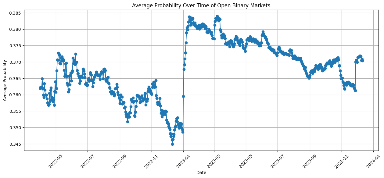 That difference seems expected: no markets tend to linger around longer, often until their planned resolution date, whereas yes resolutions can more often happen prematurely in response to some news. This also explains why the end of the calendar year is followed by a sharp increase in the average probability of open markets. However, I would also have expected to see an overall downward trend caused by markets with longer expiration dates, which hasn't materialized in the data so far, or at least might take longer to be noticeable.