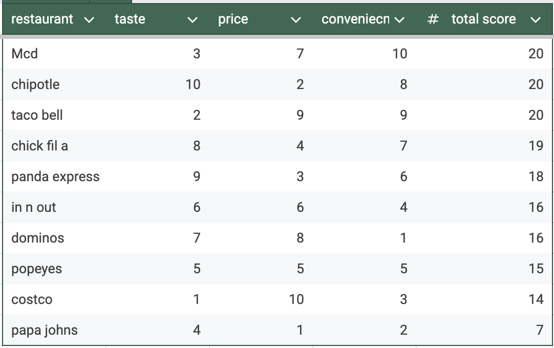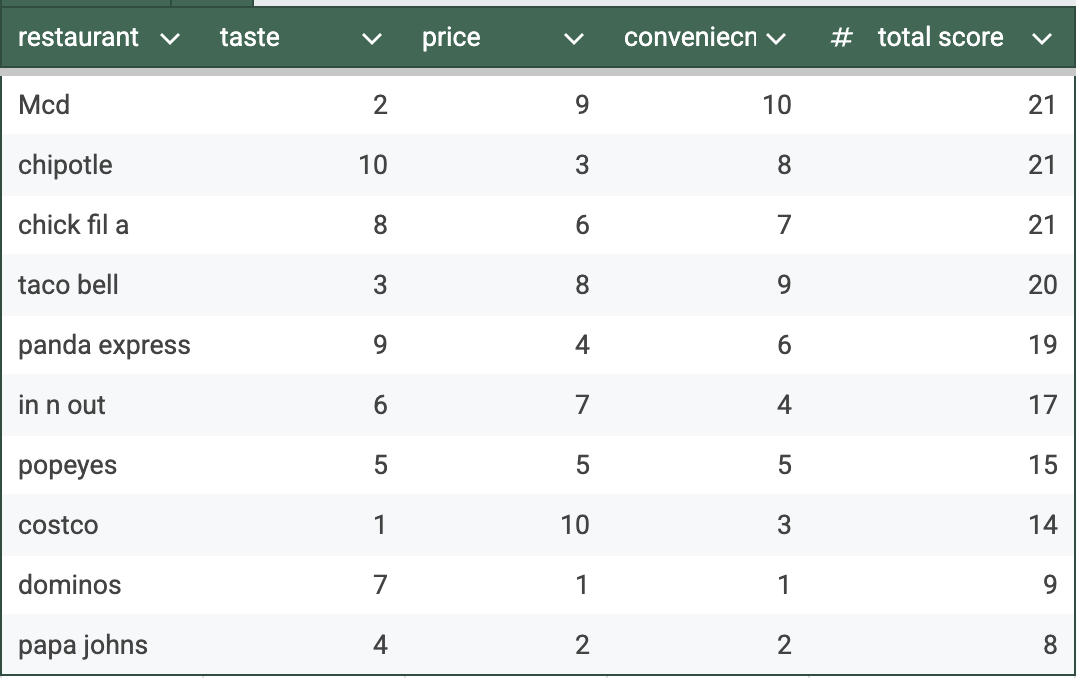 Here is the updated score. As it stands, there is a 3-way tie again between Mcd, chipotle, tacobell. I plan to resolve these 3 equally unless there is a very convincing argument that breaks this tie. Price is basically only metric I would realistically modify at this point.
