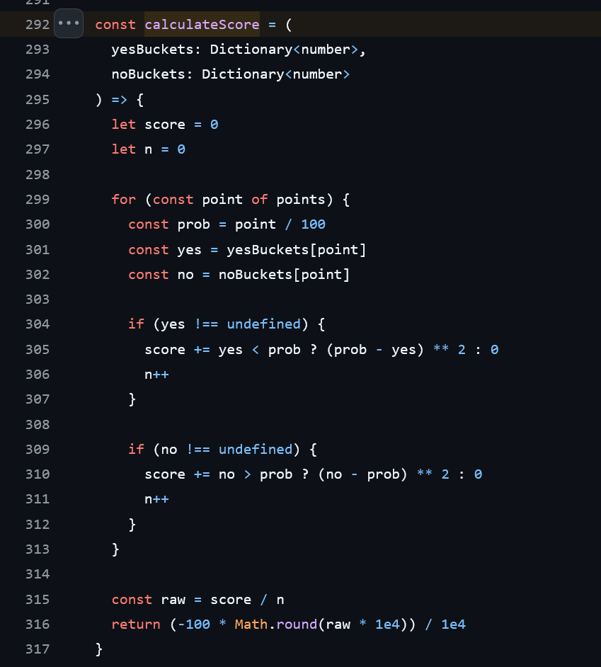 uhhh so it looks like you get points for being wrong, and then those are made negative. and iirc they only used "recent" resolutions (~100?) here, though I'm not seeing it in this function. her calibration chart does indicate a lot of misses by a fair margin.
