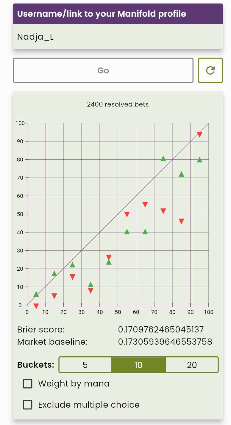 I guess a smarter thing to do would be to ask some Manifold guys how calibration was calculated (or maybe it is already somewhere, idk, I can't find it in the FAQ) and then calculate it manually. If it fails, then NA