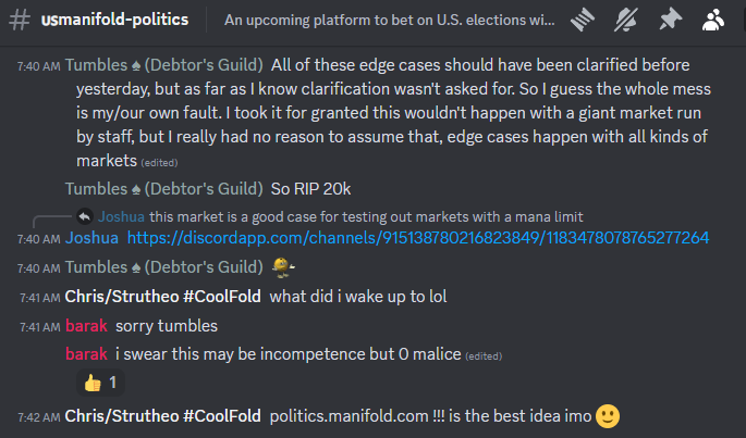An example would be apologizing or unclear resolution criteria ("main" vs "offshoot" or saying just "Feb 1" in the description without a time), for putting up politifold.com than taking it down, etc.