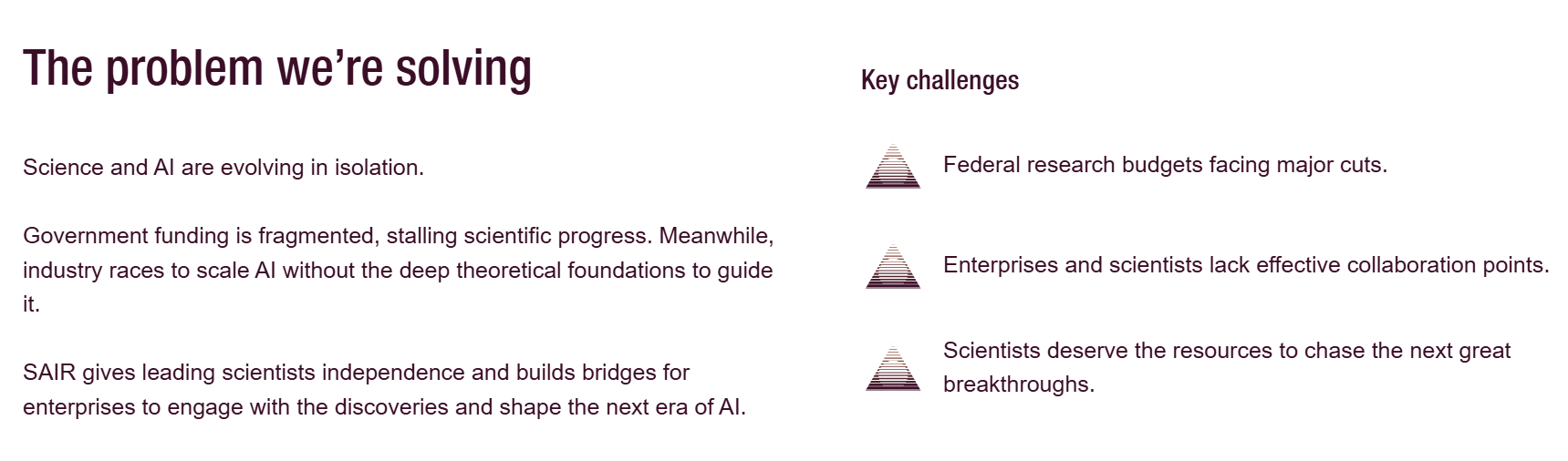 Moreover, the very morale of SAIR is "academia isn't getting the job done, so we need to take it into private hands"; I see that as a rather industrial flavor, insofar as it takes to funding fortune 500 companies and AI industries, I certainly don't see that as an academic venture...