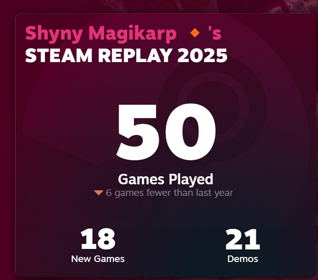 @traders Traders the Steam Replay came out a week ago, sorry for the delay! I didn't know about that! Surprised me.