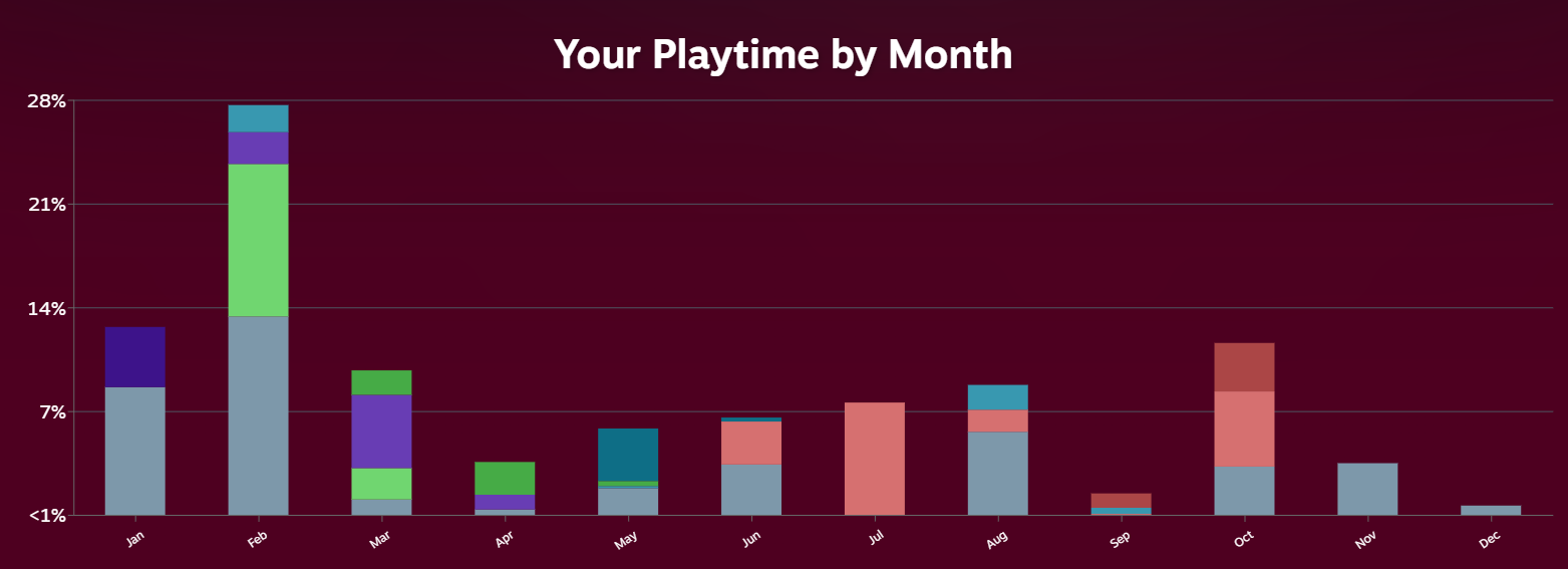 I am going to resolve in a day or so, but just as an added little interesting touch.. here is a screenshot of my Steam playtime chart by month in the replay...