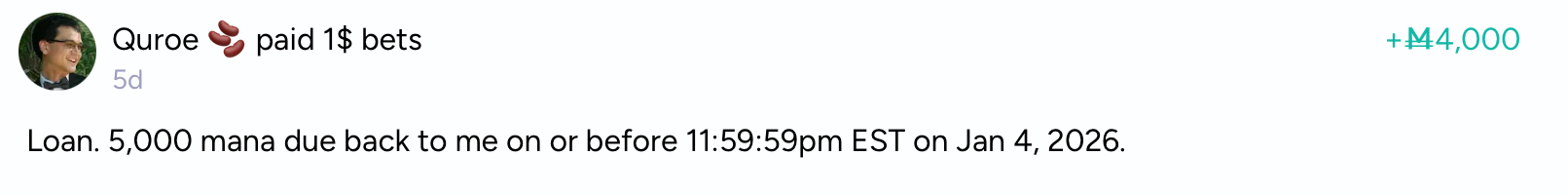 Resolution criteria. 5,000 or more mana sent to Quroe before 11.59.59pm est on Jan 4 est. can be in multiple transactions, and can be more, but must be for this specific loan.
