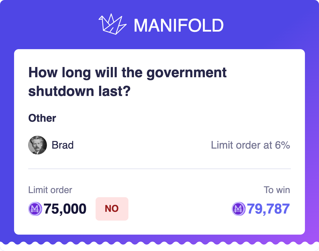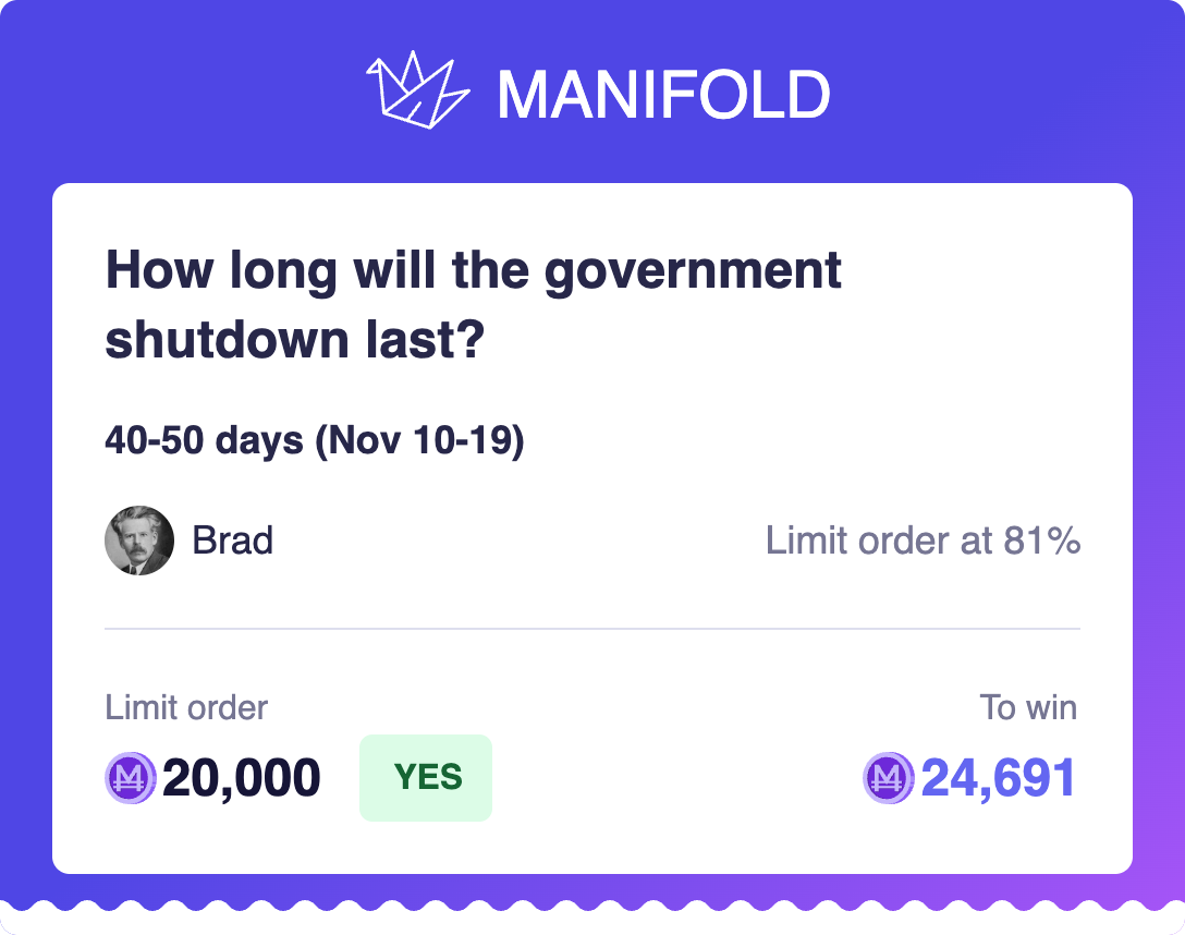 Update 2025-10-10 (PST) (AI summary of creator comment): Market close date is not fixed: The creator will extend the close date as long as the shutdown lasts to allow continued trading throughout the shutdown period.