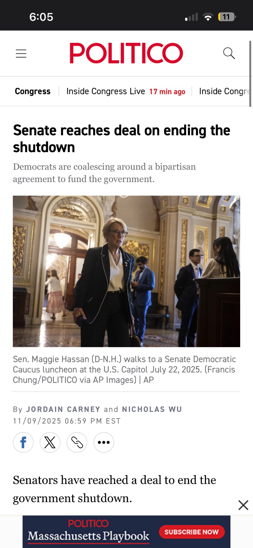 https://www.politico.com/news/2025/11/09/government-funding-deal-on-track-to-advance-sunday-night-00644110