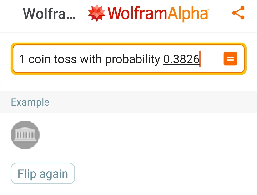 Using Wolfram Alpha I have generated a random number p, from a uniform distribution in the range [0,1]. This is the probability that my coin comes up heads on any given flip.