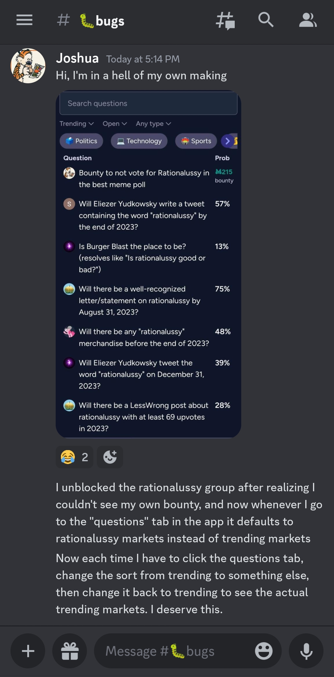 Resolves YES if @Joshua reports that this bug is no longer affecting him before close. Once the market closes, I will ask him if it is still affecting him and resolve NO if it is still affecting and YES if it is no longer affecting him. If he doesn't respond within five days, I will assume it is because he is still trapped in rationalussy hell and resolve this NO.