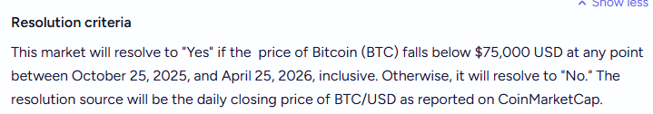 This market will resolve to "Yes" if the price of Bitcoin (BTC) falls below $75,000 USD at any point between October 25, 2025, and April 25, 2026, inclusive. Otherwise, it will resolve to "No." The resolution source will be the daily closing price of BTC/USD as reported on CoinMarketCap.