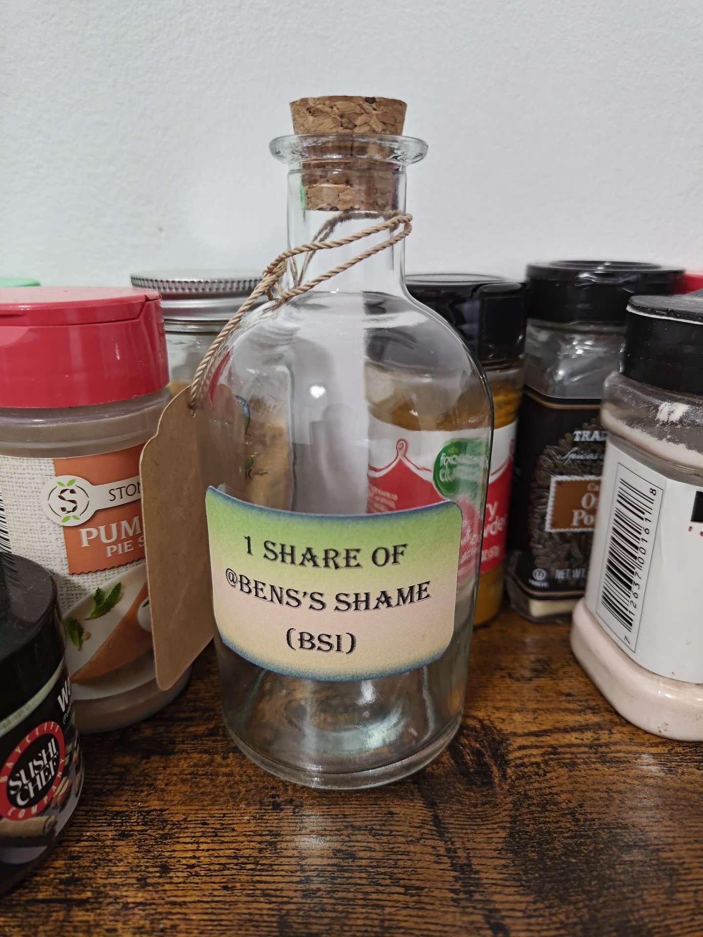 @Robincvgr As the first person to obtain a full share of BSI, I will send this ethically sourced, 100% pure extract of @bens's shame to you if you promise to never go below 1 share of BSI, on pain of shame if you do.