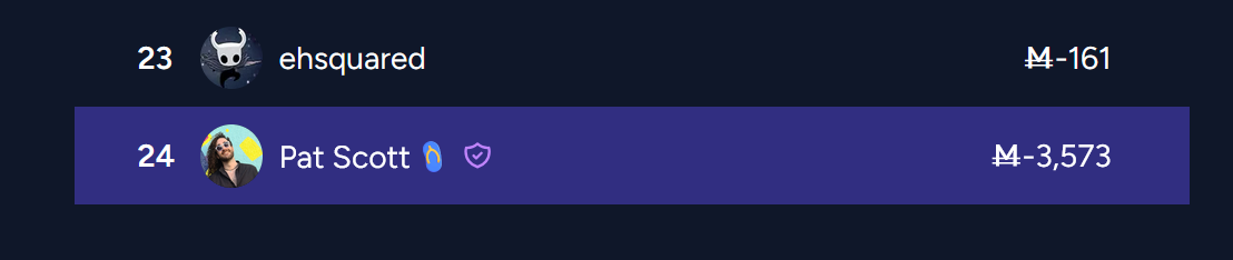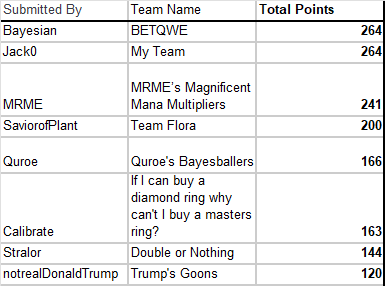 Maybe the best structure for next season is to just have a 100 mana prize with the smallest liquidity possible. Keep it simple. You risk 25 mana for a shot at 100 mana, plus unique trader bonuses.