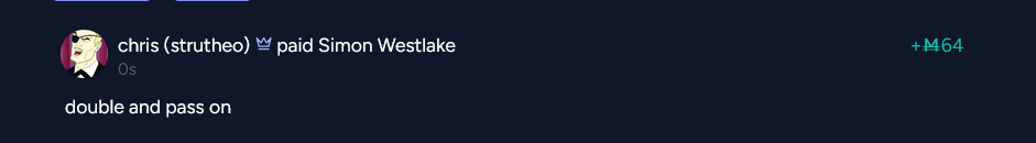 If anyone adds me to the chain whilst the amount of mana I'd need to send is <=1024 I commit to doing combinatorial futarchy over up to the first 5 people who reply to this comment or are tagged in replies who are not already in the chain. If there are fewer than two such people I will do it over 3 people of my choosing based on vibes. The metric will be whether or not the person I send it to passes it on.
