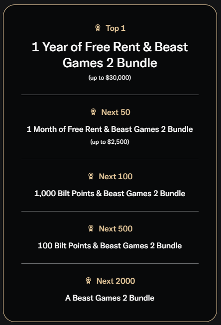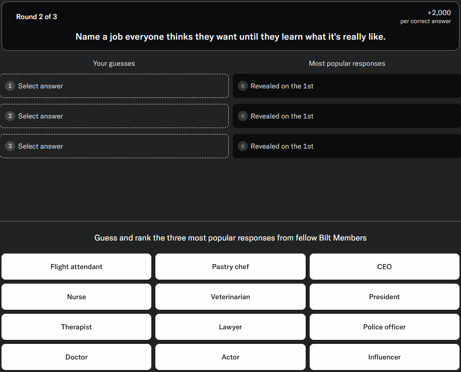 Bilt is a credit card company that has a monthly game show where they survey their users for their answers to various questions. Top scorers in the actual game get their next month's rent covered by Bilt. The top scorer this month can get a whole YEAR of rent covered.