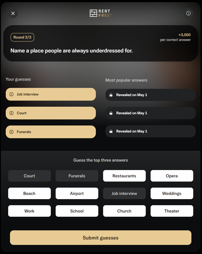Name a place people are always underdressed for. (Bilt Rent Free May 1, 2026)