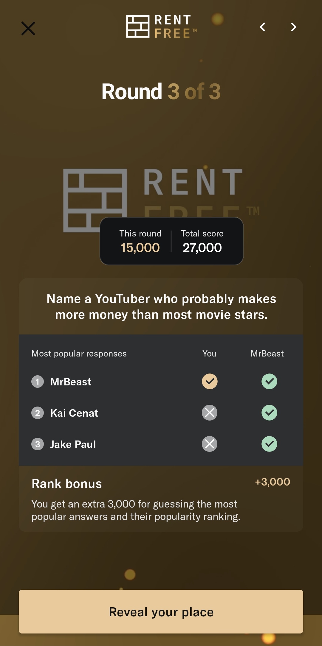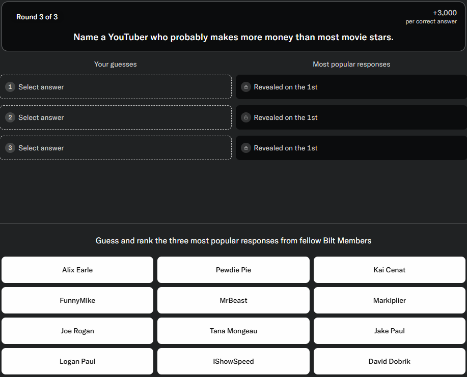 Bilt is a credit card company that has a monthly game show where they survey their users for their answers to various questions. Top scorers in the actual game get their next month's rent covered by Bilt. The top scorer this month can get a whole YEAR of rent covered.