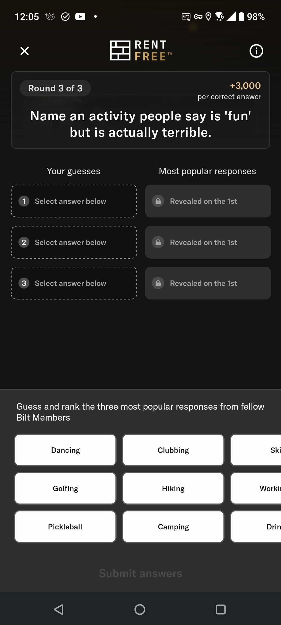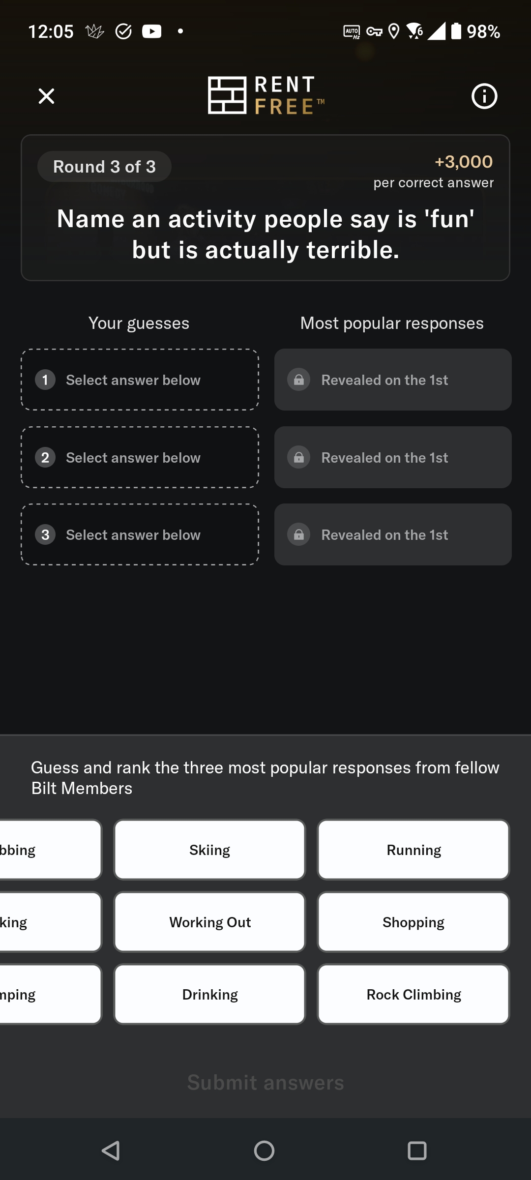 Bilt is a credit card company that has a monthly game show where they survey their users, then use those answers to run a game show. Top scorers in the actual game show get their next month's rent covered by Bilt.