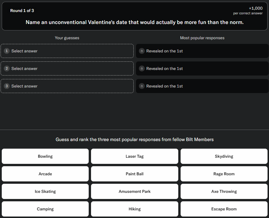 Bilt is a credit card company that has a monthly game show where they survey their users for their answers to various questions. Top scorers in the actual game get their next month's rent covered by Bilt. The top scorer this month can get a whole YEAR of rent covered.