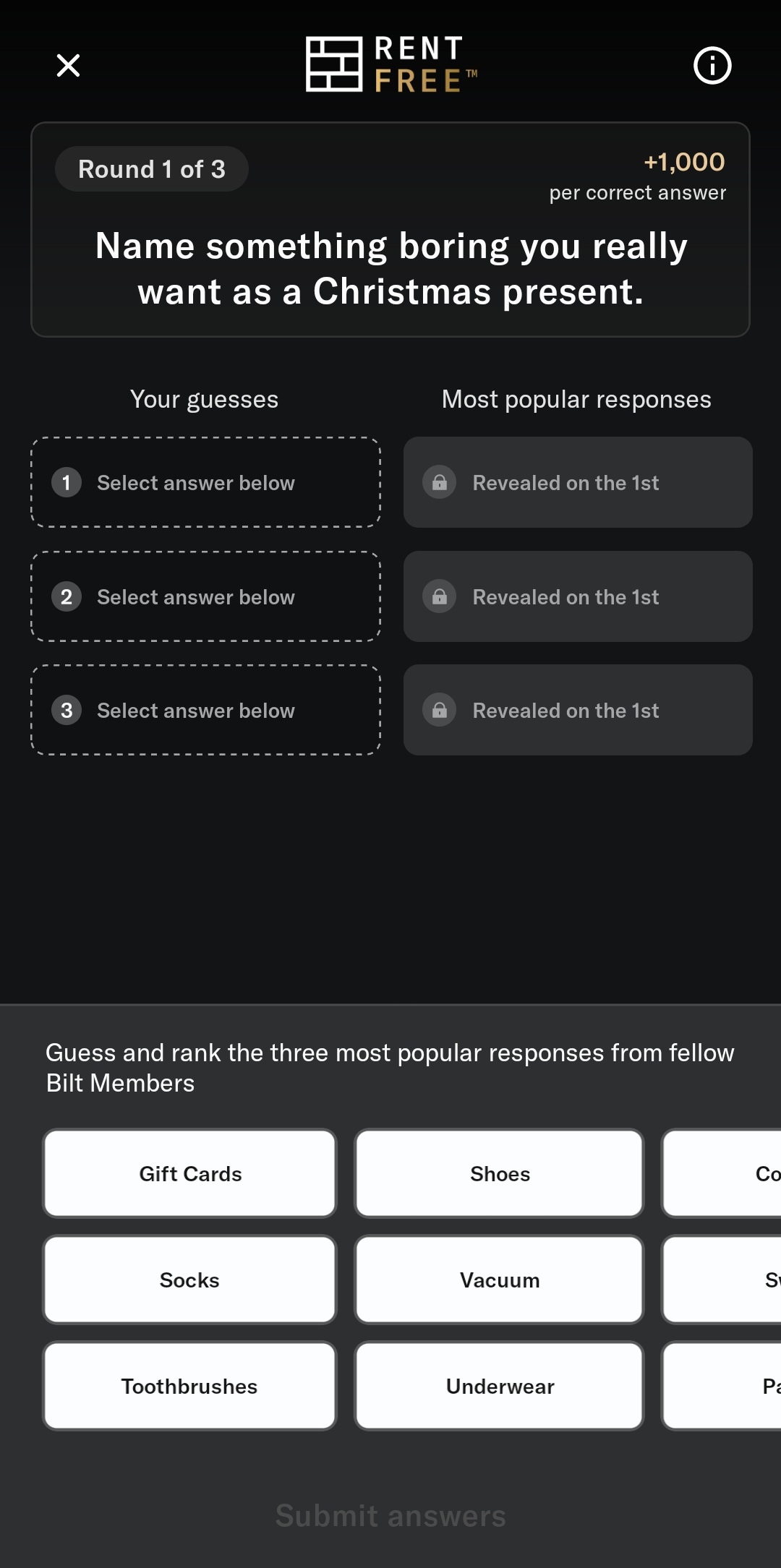 Bilt is a credit card company that has a monthly game show where they survey their users for their answers to various questions. Top scorers in the actual game show get their next month's rent covered by Bilt.