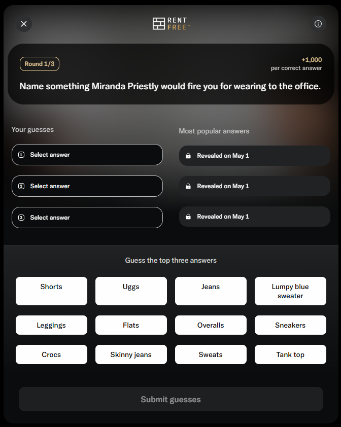 Bilt is a credit card company that has a monthly game show where they survey their users for their answers to various questions. Top scorers in the actual game get their next month's rent or mortgage payment covered by Bilt.