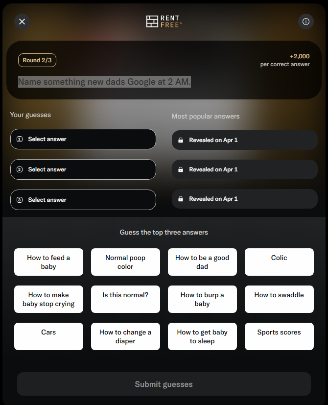 Bilt is a credit card company that has a monthly game show where they survey their users for their answers to various questions. Top scorers in the actual game get their next month's rent or mortgage covered by Bilt.