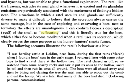 In some instances, honey badgers deter large predators by unleashing a pungent yellow liquid produced by the anal glands.
