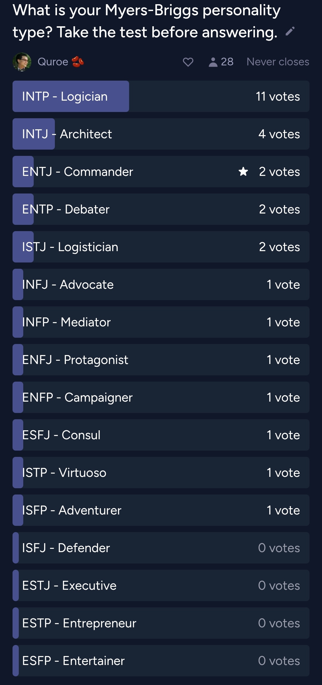 Please spend 10 minutes to take the test here before answering the poll: https://www.16personalities.com/free-personality-test