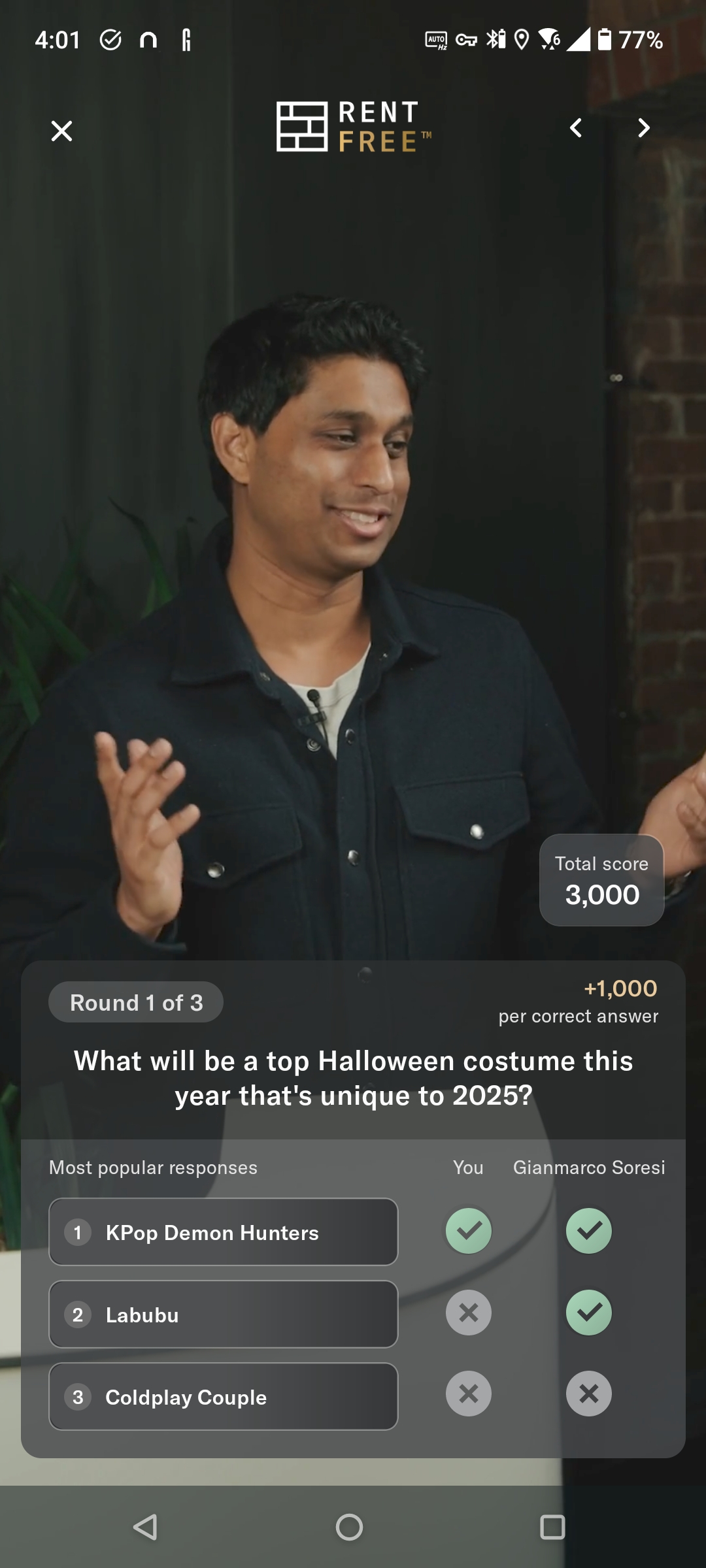 Bilt is a credit card company that has a monthly game show where they survey their users, then use those answers to run a game show. Top scorers in the actual game show get their next month's rent covered by Bilt.