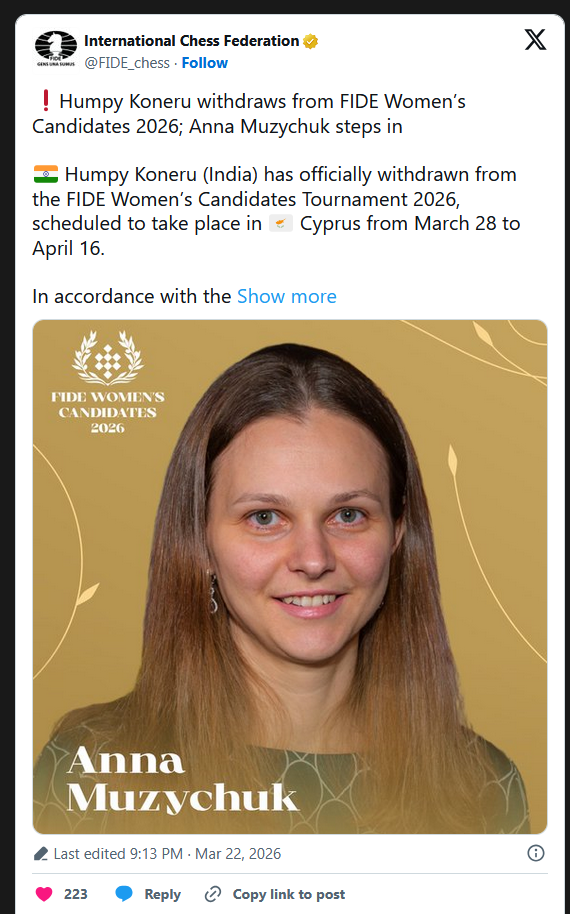 Update 2026-03-26 (PST) (AI summary of creator comment): The creator is considering renaming the Humpy option (who has withdrawn) to Anna Muzychuk as a way to add her as a participant, and is seeking consent from users with positions on that option.