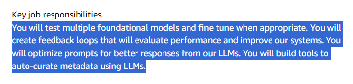 Amazon: https://www.amazon.jobs/en/jobs/2488270/senior-applied-scientist-conversational-ai-analytics-and-data-management "You will optimize prompts for better responses from our LLMs. You will build tools to auto-curate metadata using LLMs"