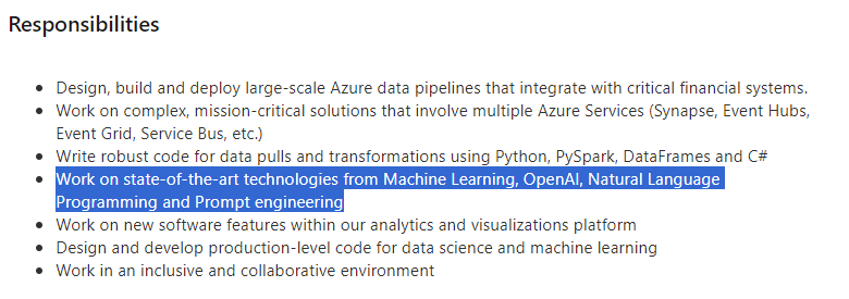 Microsoft: https://jobs.careers.microsoft.com/global/en/job/1575496/Senior-Software-Engineer "Work on state-of-the-art technologies from Machine Learning, OpenAI, Natural Language Programming and Prompt engineering"