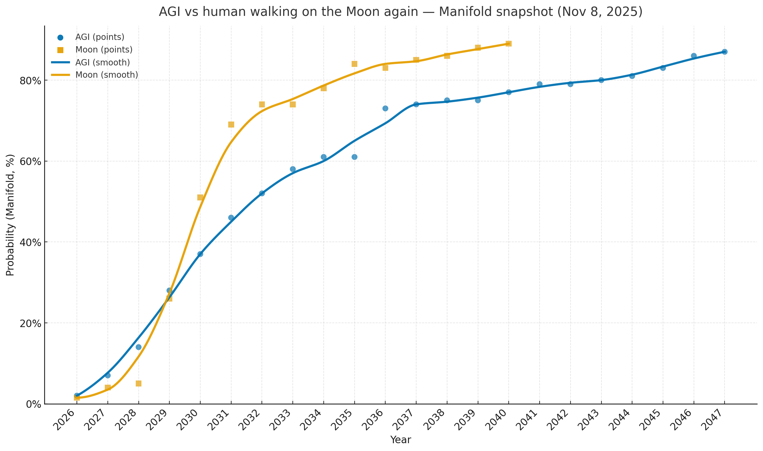 Resolves as YES if we get AGI before a human ventures again onto the Lunar surface.