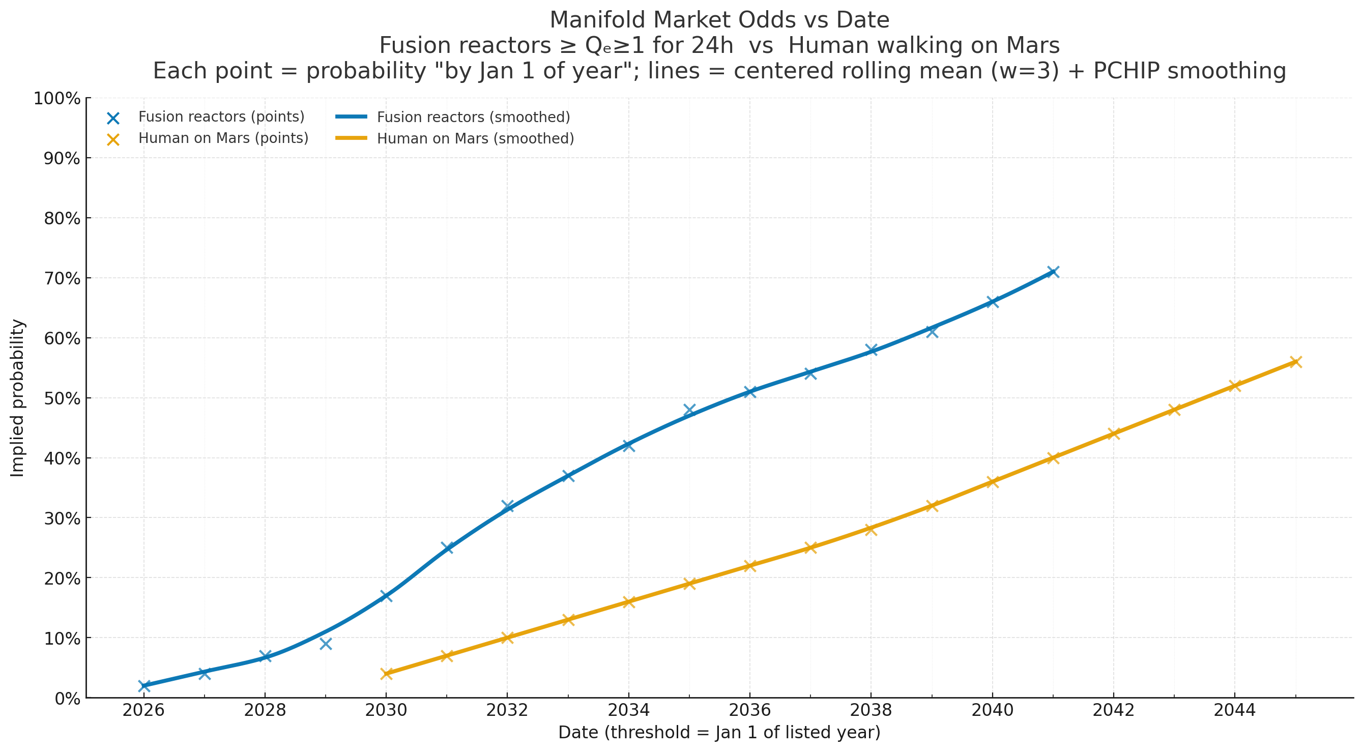 Resolves as YES if we have built a fusion reactor that has run continuously for at least 24 hours at engineering breakeven (Q_E >= 1) before a human ventures out onto the Martian surface.