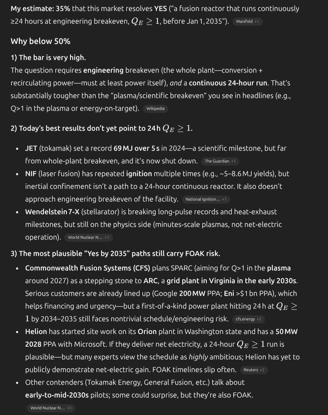Resolves as YES if we have built a fusion reactor that has run continuously for at least 24 hours prior to January 1st 2035 at engineering breakeven (Q_E >= 1).