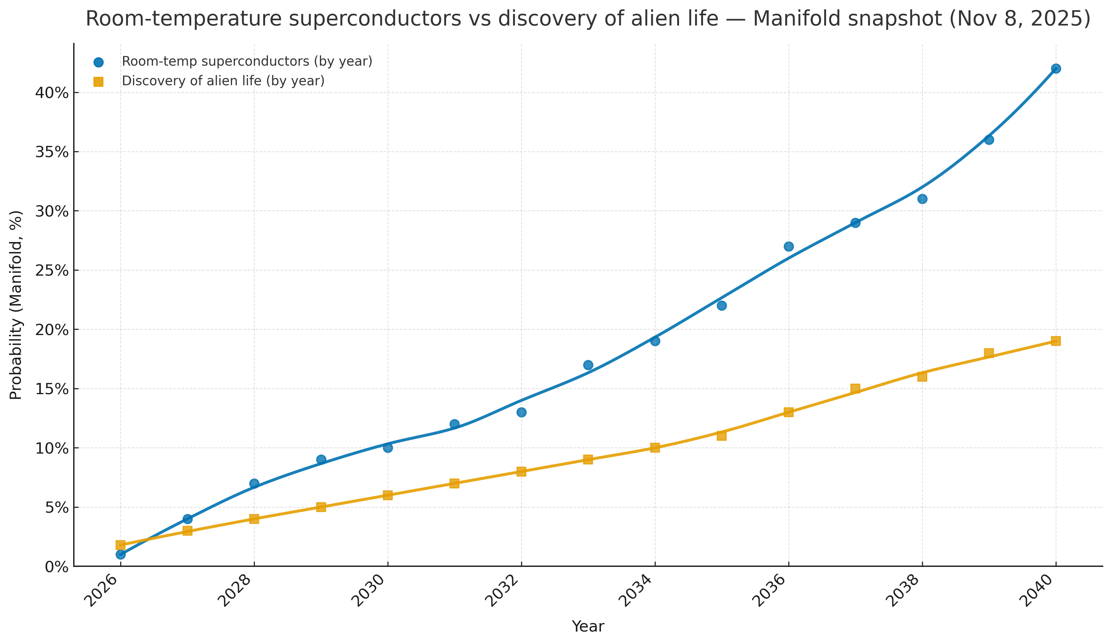 Resolves as YES if a superconductor at room temperature and ambient pressure has been discovered, synthesized and measured to be a superconductor before we discover strong evidence of past or present extra-terrestrial life