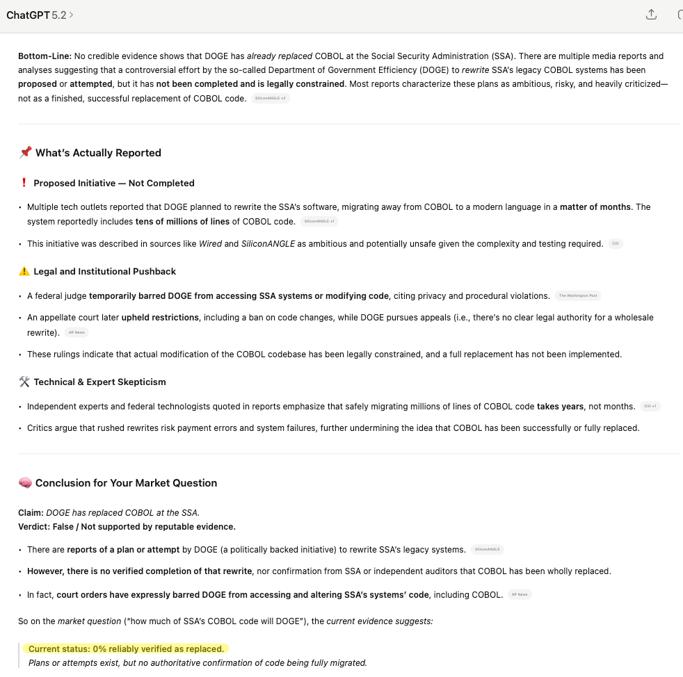 DOGE has announced plans to rewrite the Social Security Administration's software systems, which contain more than 60 million lines of COBOL code. This market asks what percentage of that code will be successfully replaced with modern programming languages by the end of 2025.