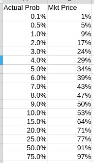 The purpose of this market is to allow precise betting on long odds for this event. Given the resolution criteria, a fair price for this market would be x/(x+(1-x)/10), where x is the actual probability of the event. For example, if you think this has a 3% chance of happening, this market should be at ~24%.