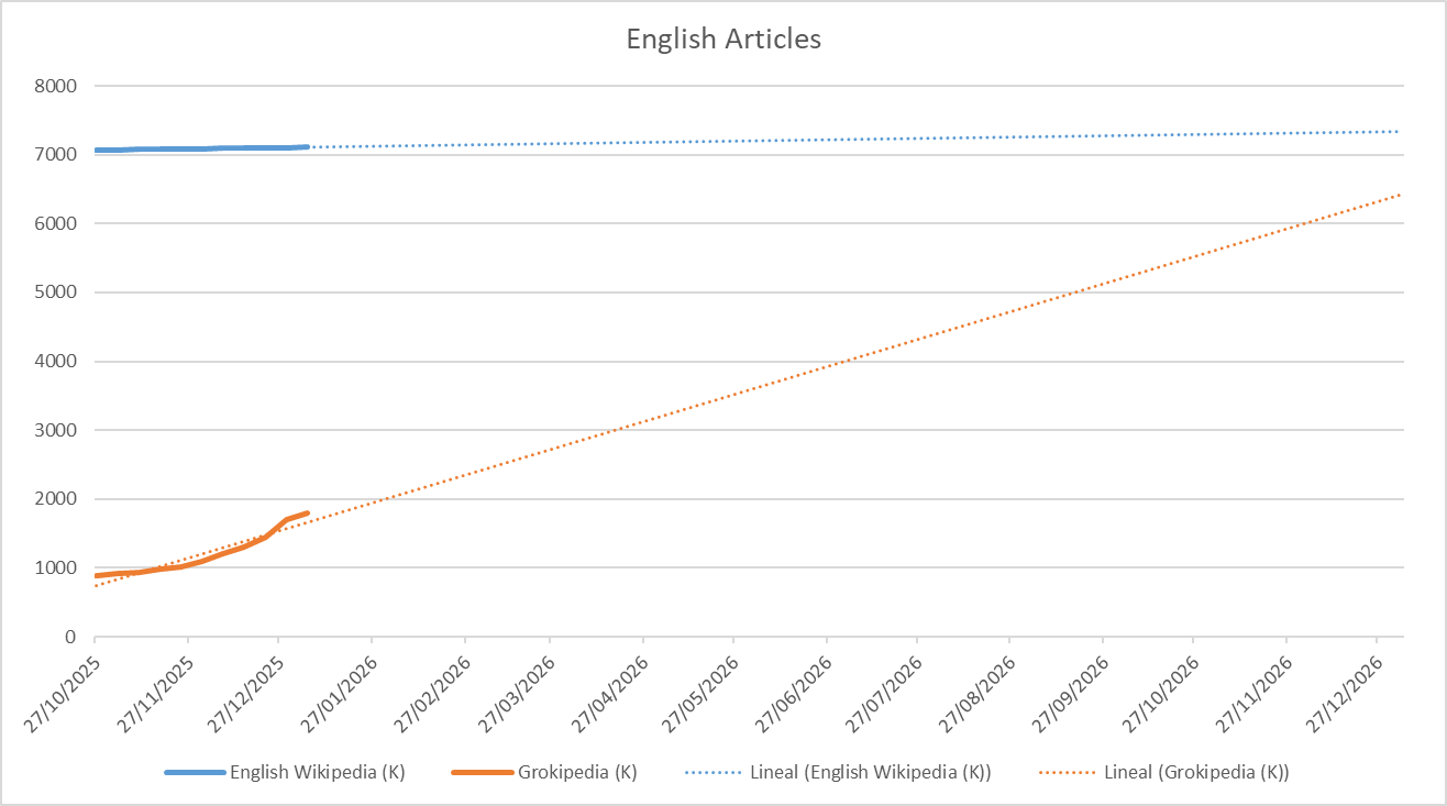 Resolves YES if at any point before EOY 2026, the articles available on Grokipedia exceed the amount of articles on Wikipedia's English site.