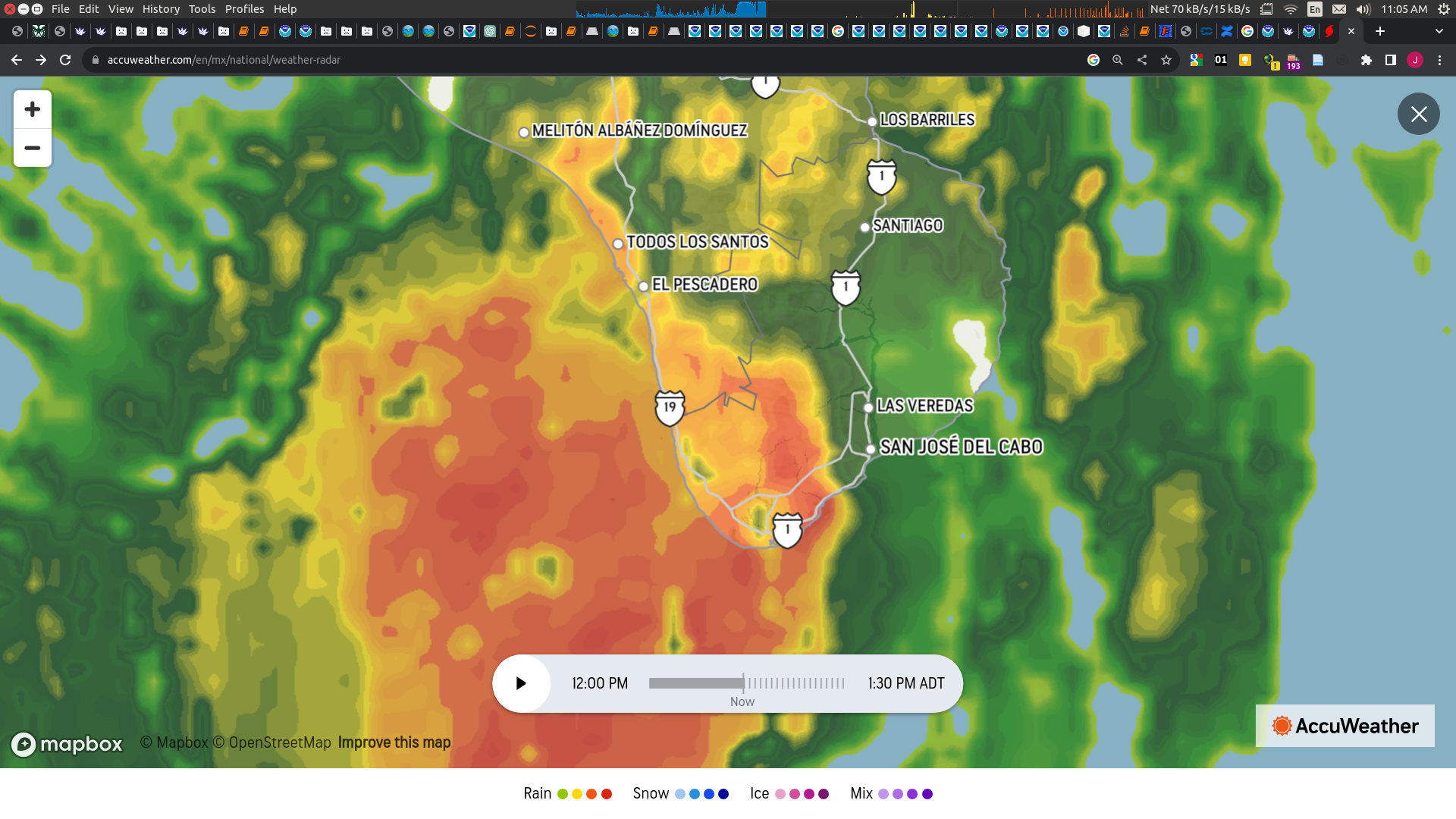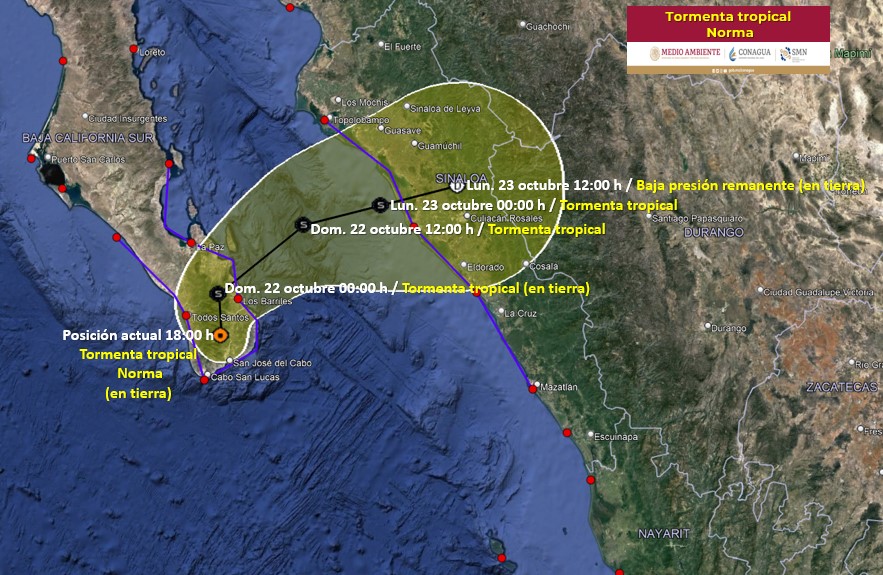 Hurricane Norma was downgraded to category 1 on the Saffir-Simpson scale. It is located on land in the town of Todos Santos, in the municipality of La Paz, BCS. Its most dangerous quadrant is affecting the municipalities of Los Cabos and La Paz, BCS. Because it moves slowly, the damage is expected to be greater.
