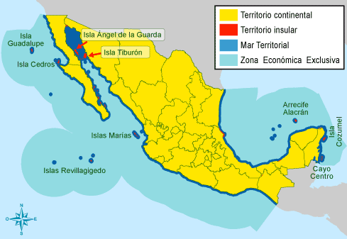 This figure from National Institute of Statistics and Geography (INEGI) of Mexico would be a good reference. Yellow area would be the mainland territories (territorio continental) of Mexico.