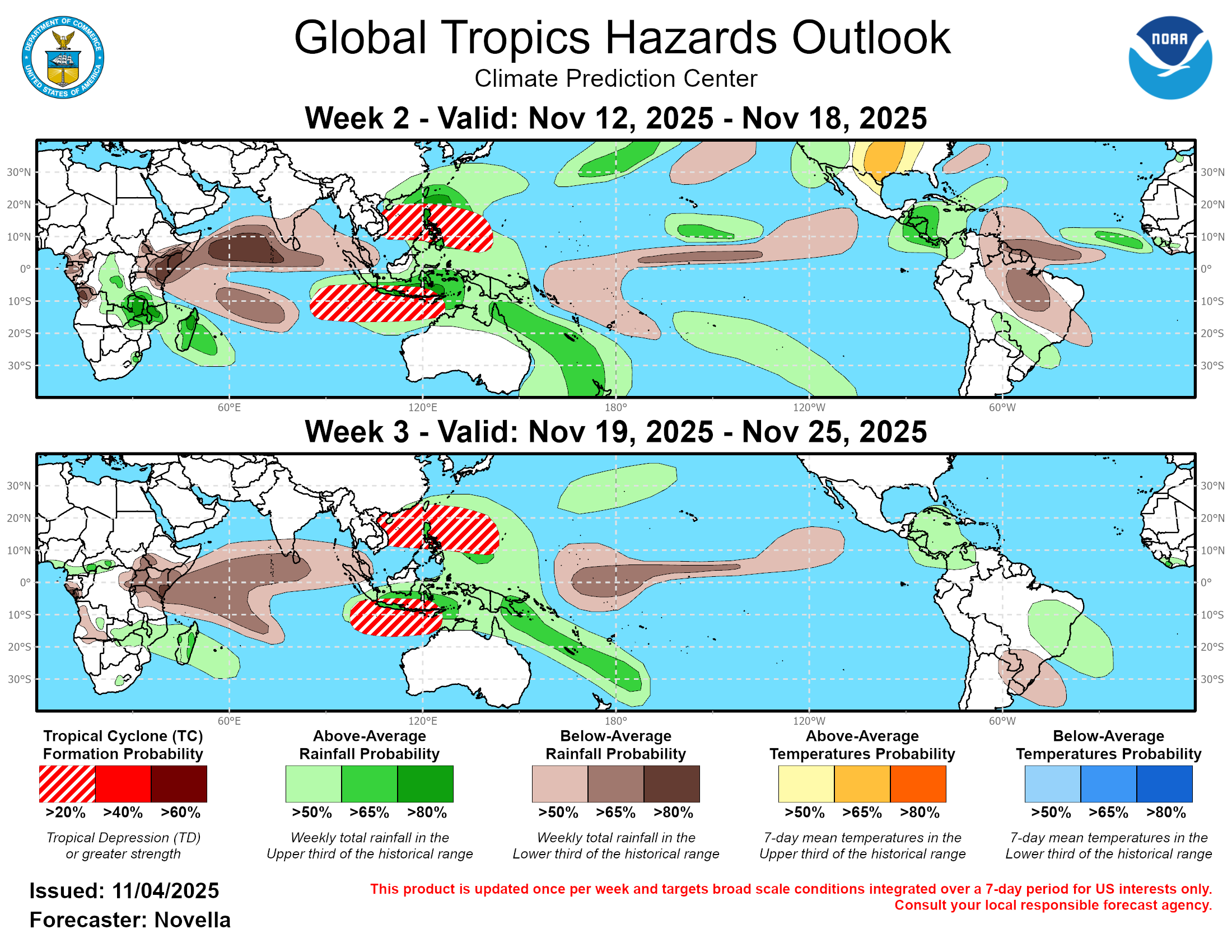In the western Hemisphere, probabilistic genesis tools continue to depict modest signals in the southern Caribbean, with the GEFS being strongest with TC potential towards mid-November. While TC development cannot be ruled out, no corresponding TC areas are posted for week-2 due to high false alarm rates in the GEFS, lesser support in the Google AI guidance, and near to above-normal shear conditions favored. By week-3, shearing is favored to ease in the GEFS and ECMWF guidance, however a much quieter climatology over the Caribbean during the 3rd dekad of November precludes the issuance of any TC areas for week-3. In spite of having no TC areas being posted, near to above-normal precipitation remains favored over Central America and the western Caribbean, where any enhanced precipitation amounts may exacerbate ground conditions and stall recovery efforts in Jamaica following the devastating impacts of Hurricane Melissa last month.